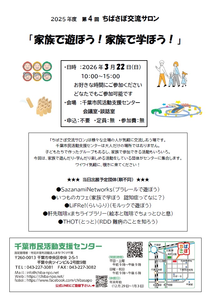 2025年度 第4回の交流サロンを開催します。 「ちばさぽ交流サロン」は様々な立場の人が気軽に交流しあう場です。 千葉市民活動支援センターは大人だけの場所ではありません。 子どもたちで作ったグループもあるし、家族で参加できる活動もいろいろ。 今回は、家族で遊んだり・学んだり楽しめる活動をしている団体がセンターに集合します。 参加費無料。ワイワイ気軽に、お好きな時間にご参加ください! ●テーマ:ちばさぽ交流サロン(2025年度 第4回) 「家族で遊ぼう!家族で学ぼう!」 〇開催日:2026年3月22日(日) 〇時 間:10:00~15:00 〇会 場:千葉市民活動支援センター 会議室・談話室 〇定 員:なし(出入自由) 〇参加費:無料 〇対 象:どなたでも ●当日出店予定の団体(順不同) ・SazanamiNetworks 内容:プラレールで遊ぼう ・いつものカフェ 内容:家族で学ぼう 認知症ってなに? ・LiFRe!(らいふり) 内容:モルックで遊ぼう ・軒先珈琲xまちライブラリー 内容:絵本と珈琲でちょっとひと息 ・THOT(とっと) 内容:RDD難病のことを知ろう 〇お問合せ 千葉市民活動支援センター ・TEL:043-227-3081 ・FAX:043-227-3082 ・メール:info@chiba-npo.net第4回交流サロンちらし260322 ← PDFはこちら